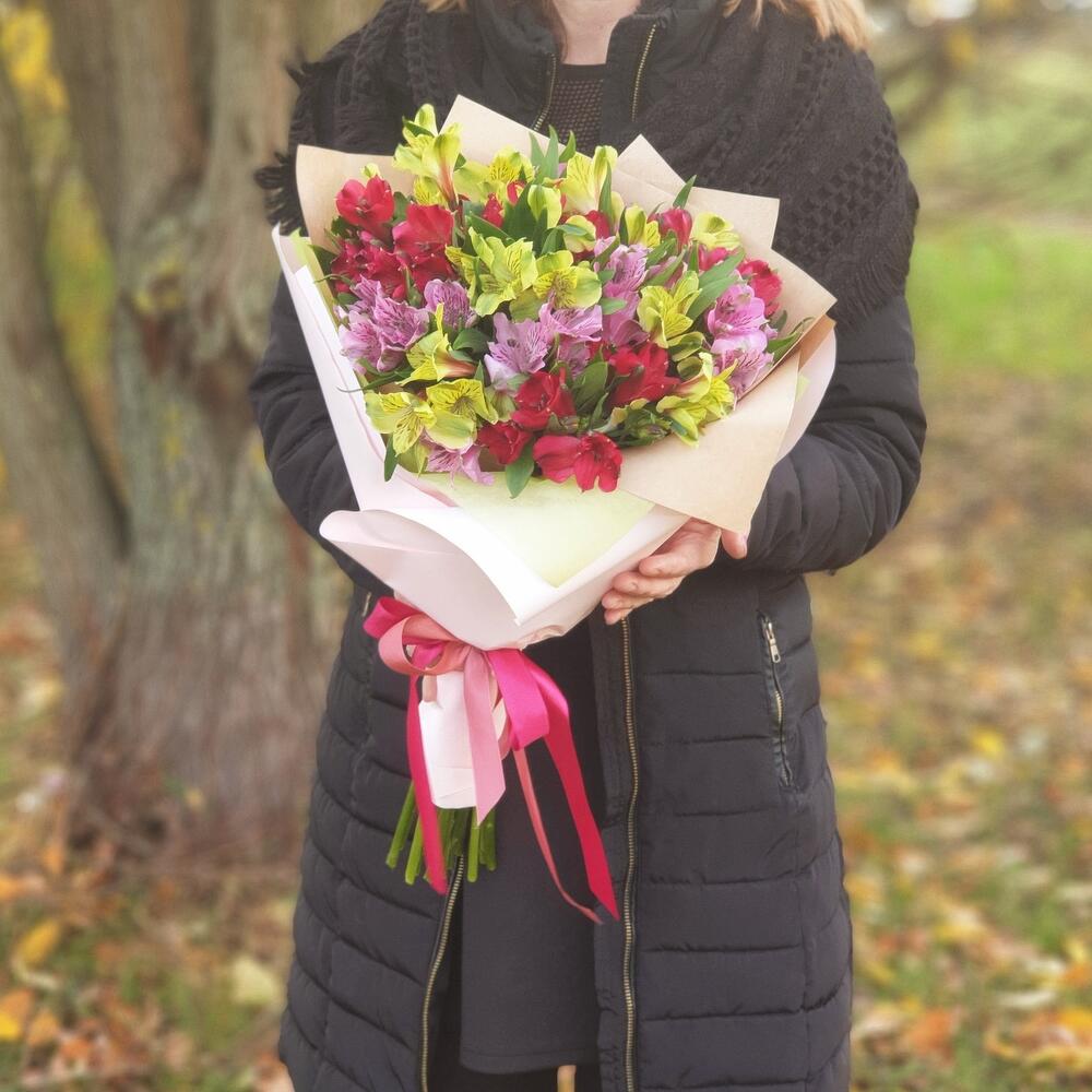 Лента атласная – 2 шт.Упаковка дизайнерская – 3 шт.Открыточка с вашими пожеланиями – 1 шт.Альстромерия Микс Европа – 9 шт.любовь флориста (бесплатно) – 1 шт.