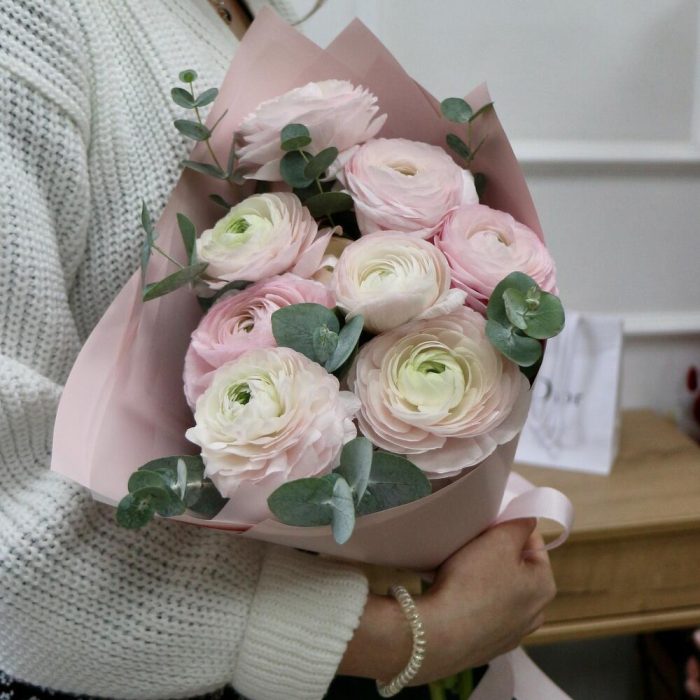 Букет розовых ранункулюсов и эвкалипта –