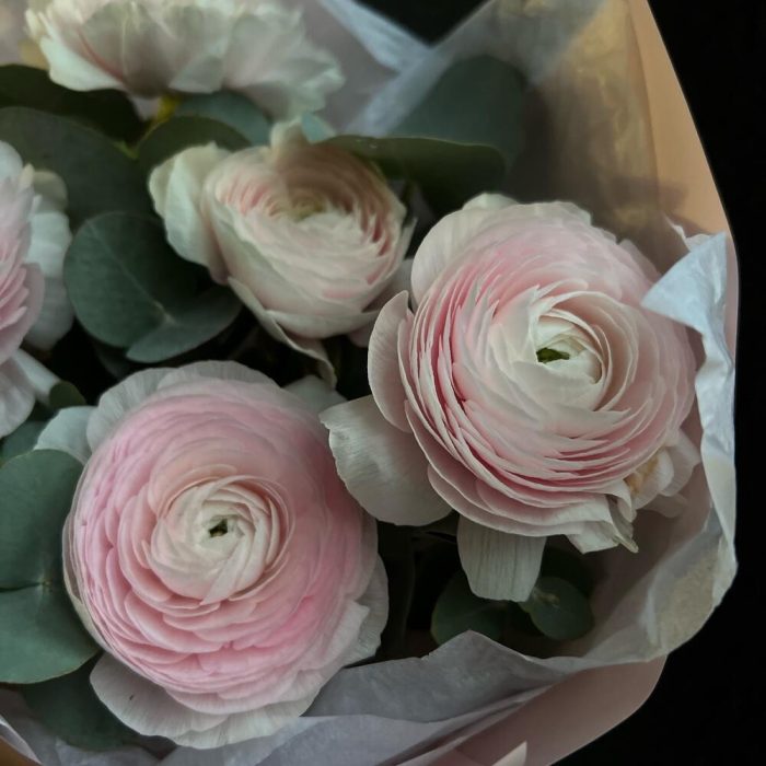 Ранункулюс – 5 шт.Эвкалипт – 5 шт.декоративная упаковка – 1 шт.Атласная лента – 1 шт.