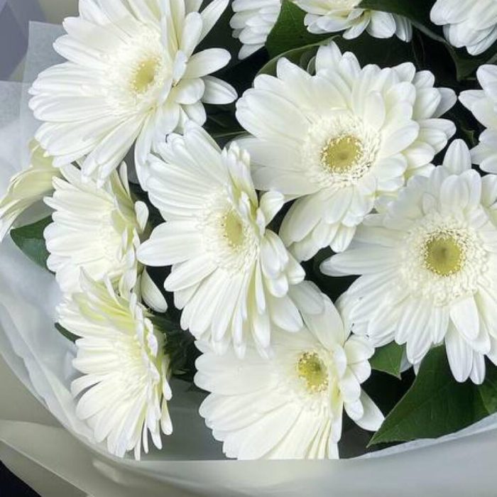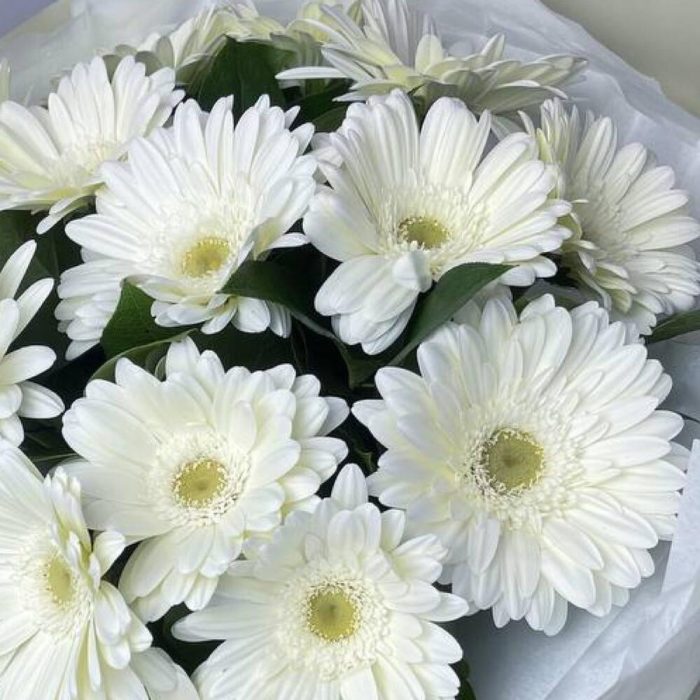 Гербера белая – 17 шт.Салал пучок – 1 шт.Пленка матовая – 8 шт.Тишью белое – 2 шт.