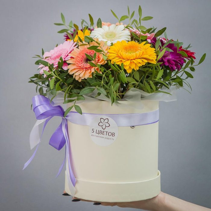 Гербера желтая – 3 шт.Гербера красная – 3 шт.Гербера розовая – 3 шт.Гербера белая – 2 шт.Гербера кремовая – 2 шт.фиолетовая – 2 шт.