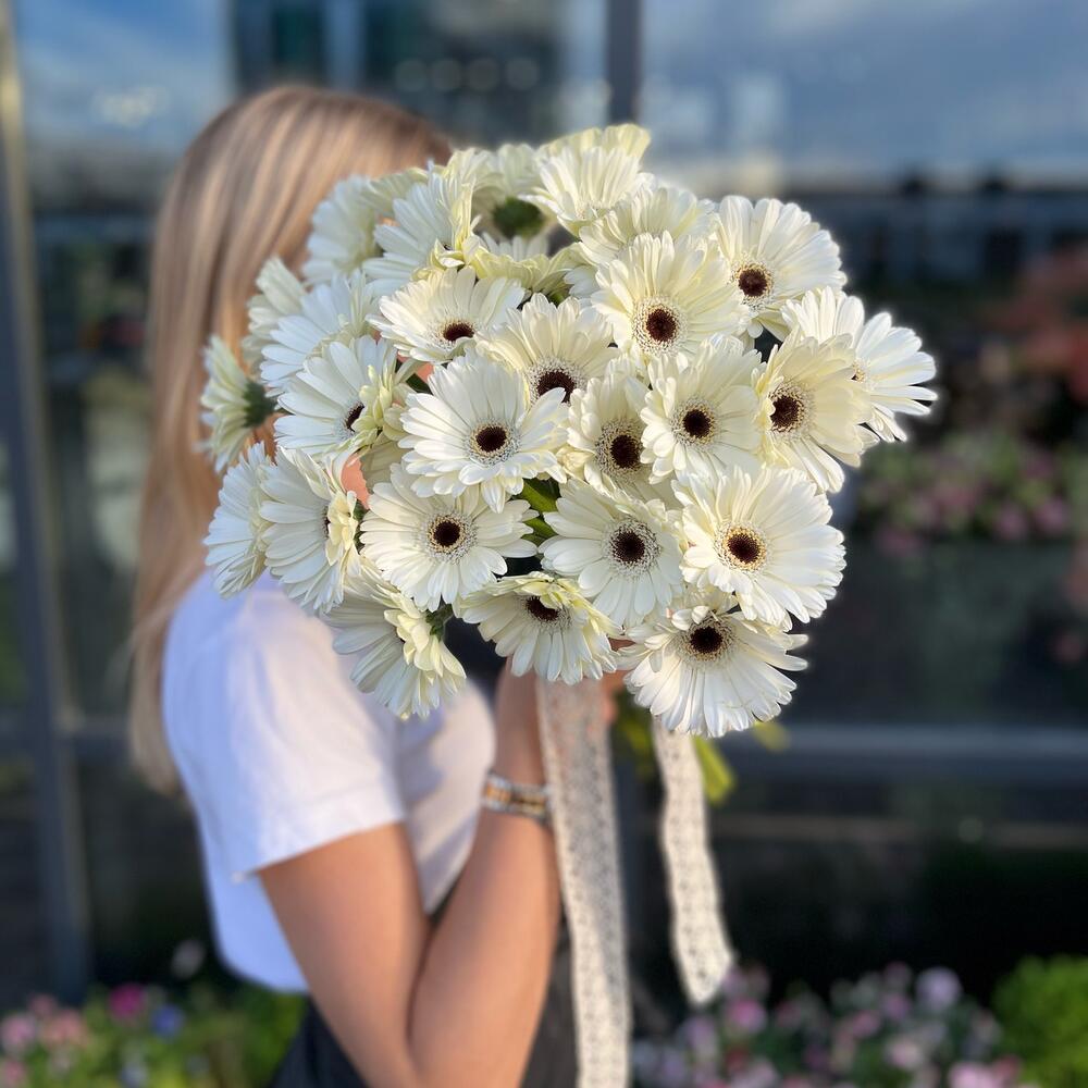 Гербера – 27 шт.Атласная лента – 1 шт.