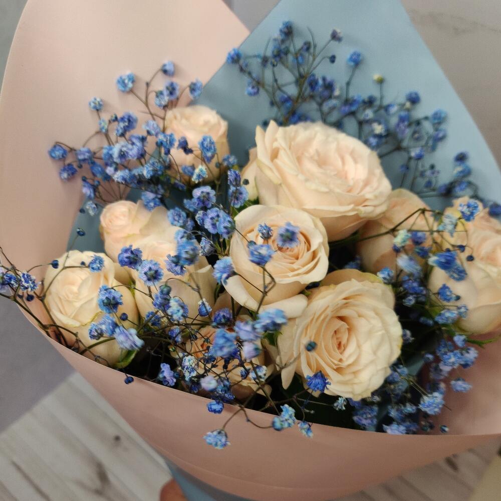 Упаковка дизайнерская – 1 шт.гипсофила радужная – 1 шт.розы кустовые – 4 шт.