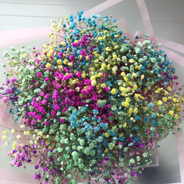 гипсофила радужная – 11 шт.Упаковка дизайнерская – 2 шт.Лента атласная – 1 шт.