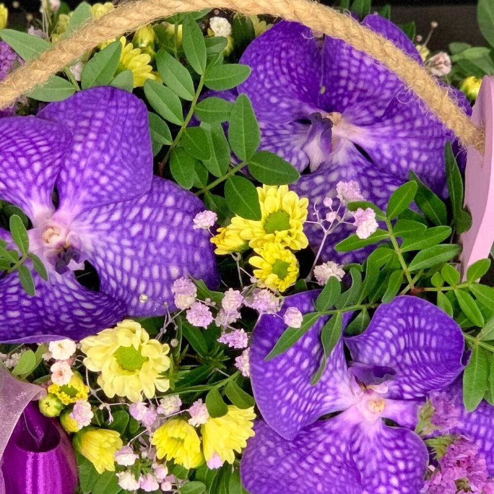 Ящик деревянный – 1 шт.Оазис флористический – 1 шт.Лента атласная – 2 шт.Орхидея Ванда – 3 шт.Фисташка – 2 шт.Сантини – 2 шт.Гипсофила – 1 шт.