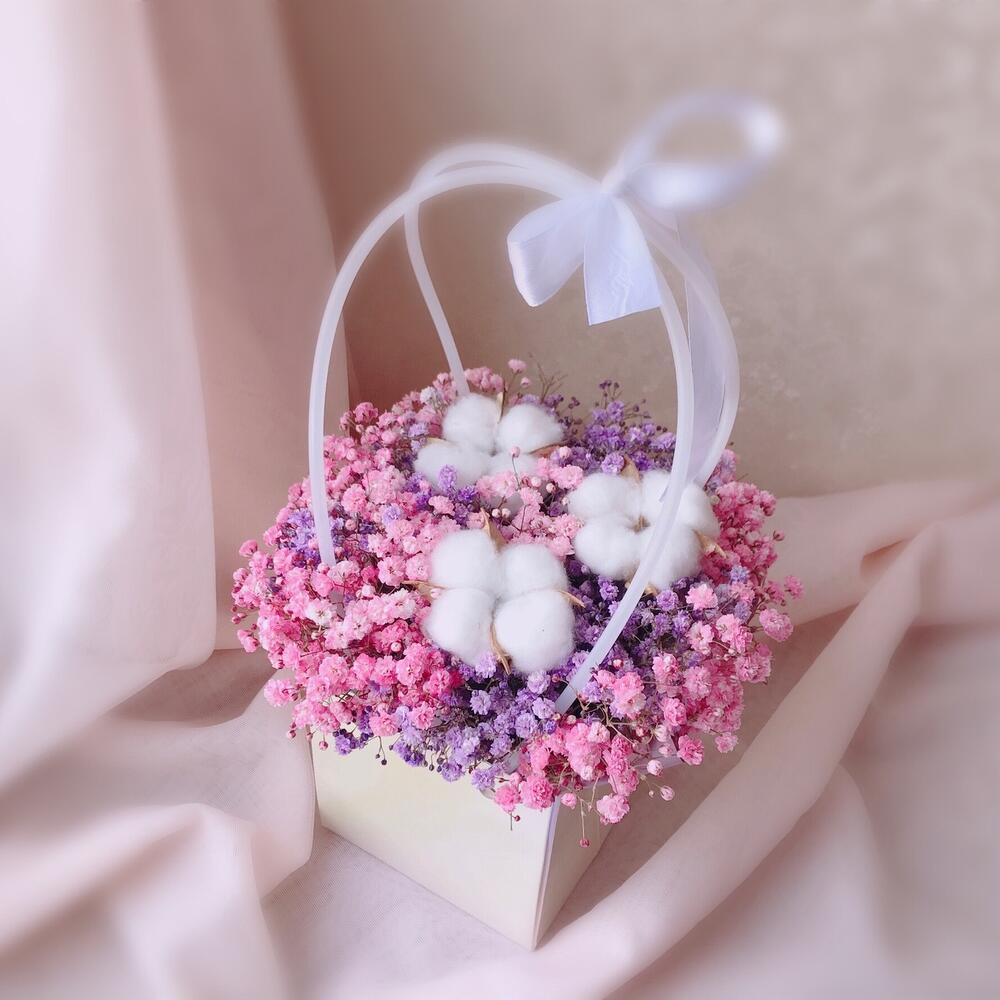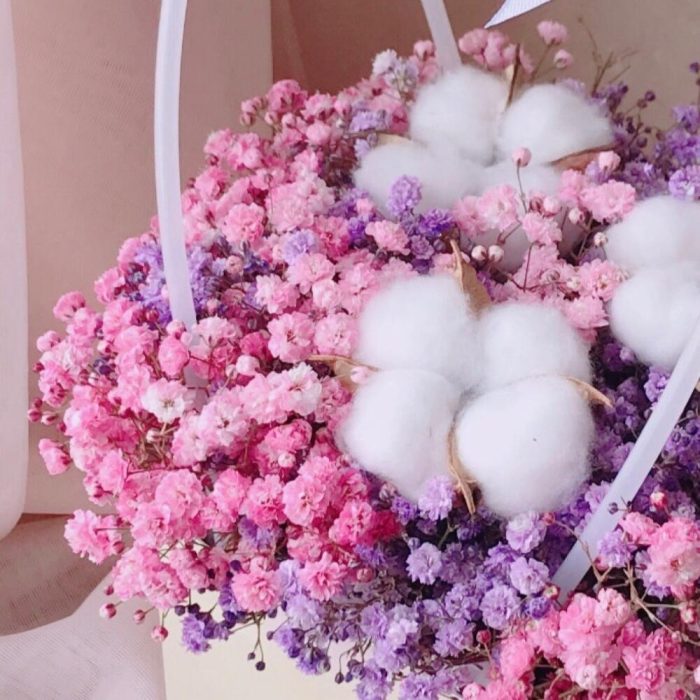 Хлопок – 3 шт.Лента атласная – 1 шт.Сумочка – 1 шт.Флористическая губка (оазис) – 1 шт.радужная гипсофила – 3 шт.