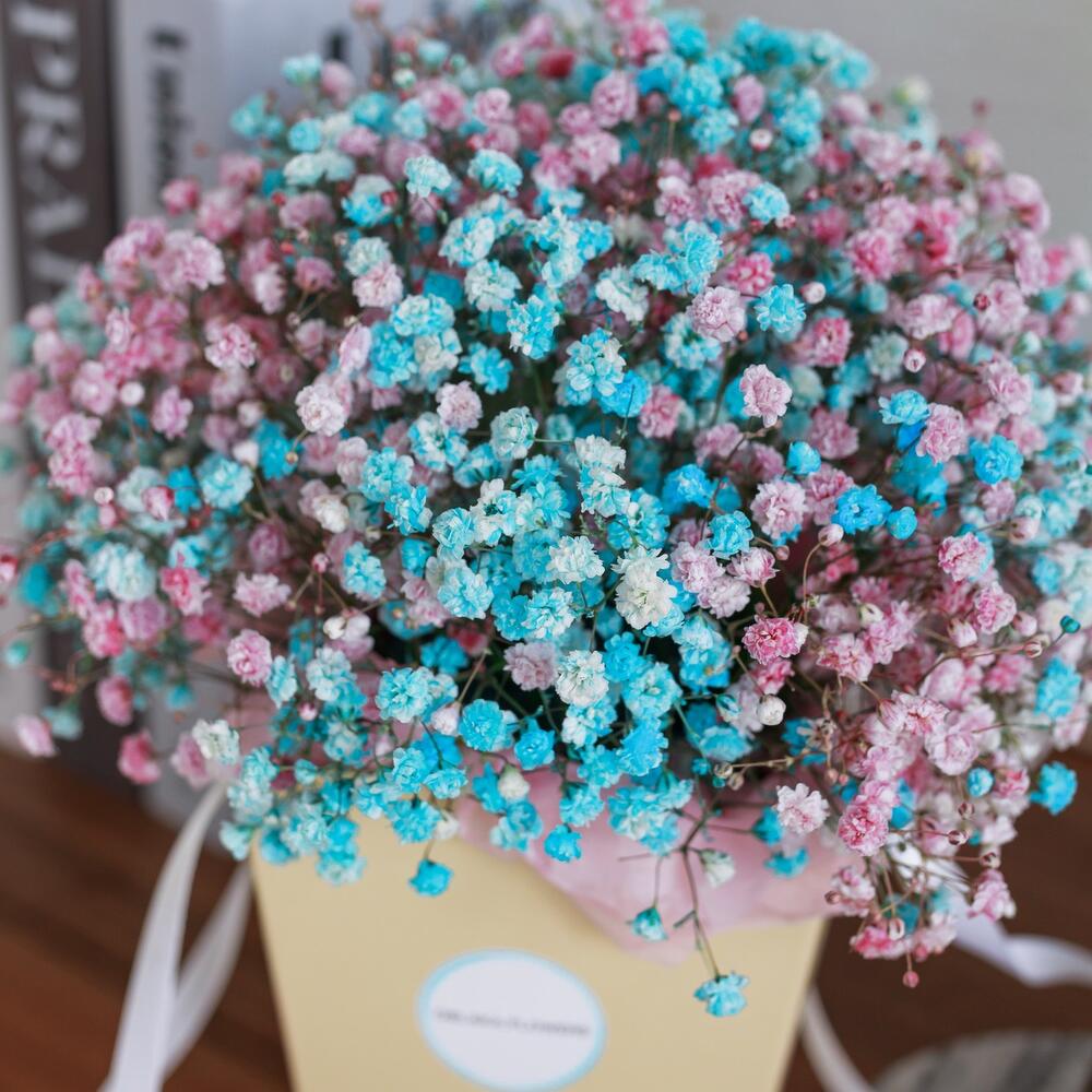 Очаровательная, воздушная композиция из гипсофилы, в коробке сумочка .Цветы стоят в специальной флористической губке,что позволяет им больше оставаться свежими и радовать получателя. Так же композиция в коробке это очень удобно и эффектно, так как не надо ставить букет в вазу и менять воду. Необходимо лишь подливать в губку воду.Инструкция по уходу за цветами прикреплена к каждому заказу.Цветы гипсофилы отличаются стойкостью и даже при высыхании не теряют, декоративности и цвета. Что позволяет, долгое время украшать интерьер в качестве сухоцветов.Подпишем открытку с вашими пожеланиями бесплатно