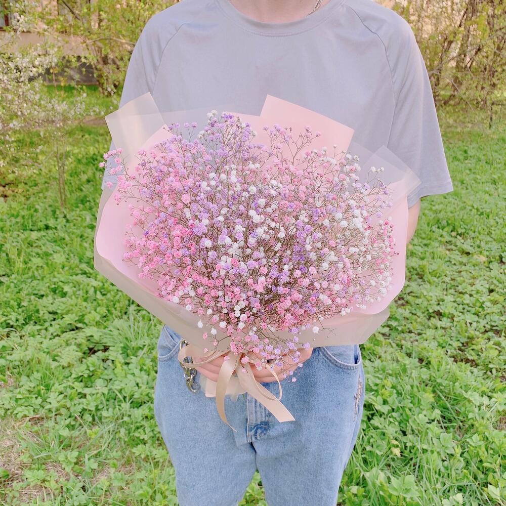 Лента атласная – 1 шт.Дизайнерская упаковка – 1 шт.инструкция по уходу за цветами – 1 шт.гипсофила радужная – 5 шт.любовь флориста (бесплатно) – 1 шт.витамины для цветов – 1 шт.