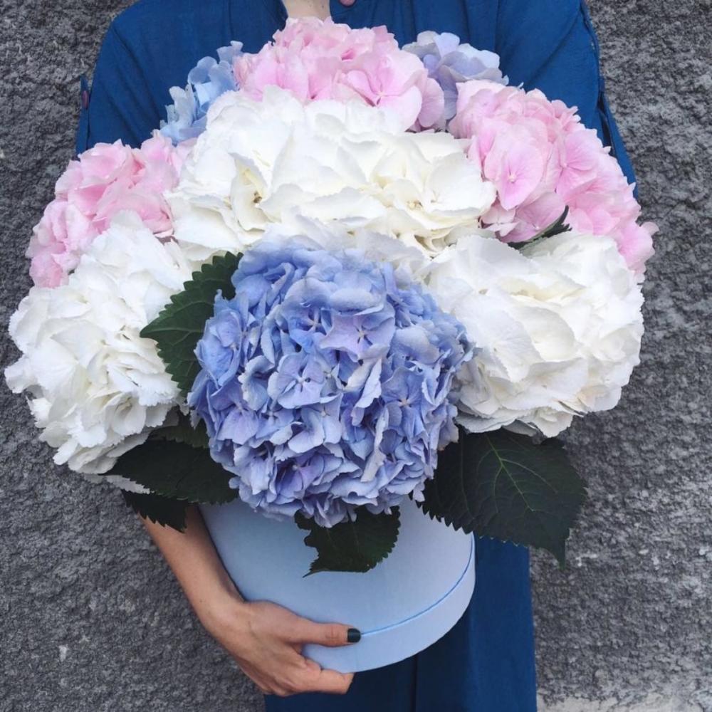 Гортензия – 9 шт.Шляпная коробка – 1 шт.Оазис флористический – 2 шт.