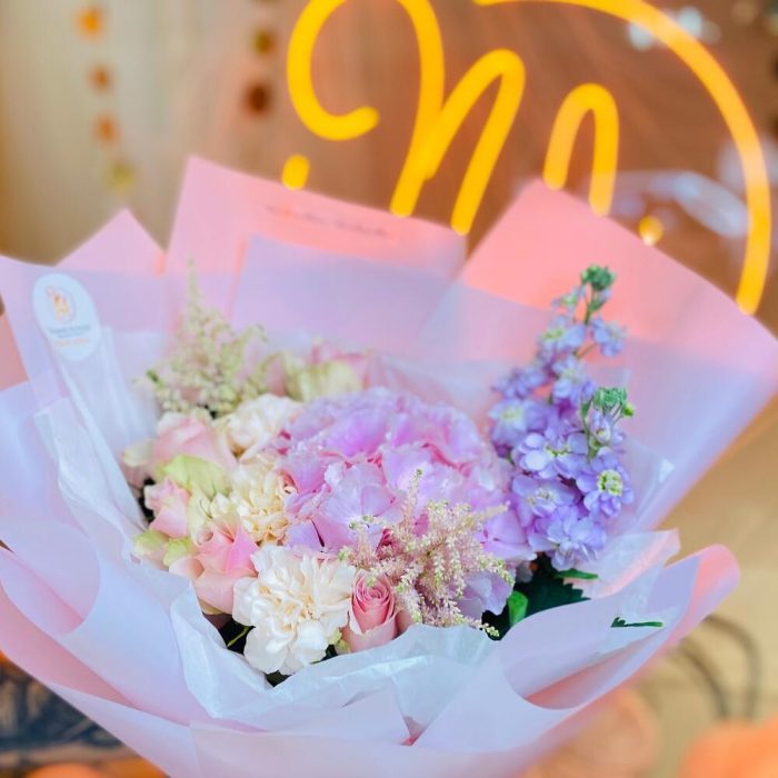 Гортензия розовая – 1 шт. діантус – 3 шт. матіола – 2 шт. троянда рожева – 5 шт. екзотична зелень – 3 шт. оформлення букета в упаковка – 1 шт.