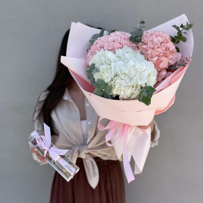 Королевские гортензии с добавлением эвкалипта и коробка клубники в бельгийском шоколаде