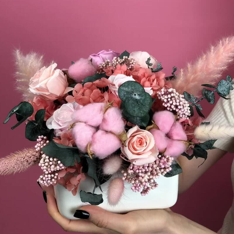 Хлопок – 5 шт.Керамическое кашпо – 1 шт.гортензия стабилизированная – 20 гр.рисовый цветок – 2 шт.стабилизированные цветы микс – 21 шт.