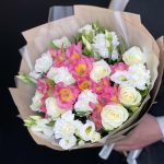 Роза – 9 шт.Альстромерия – 3 шт.Эустома – 2 шт.Фисташка – 3 шт.Крафт – 3 шт.Диантус – 6 шт.