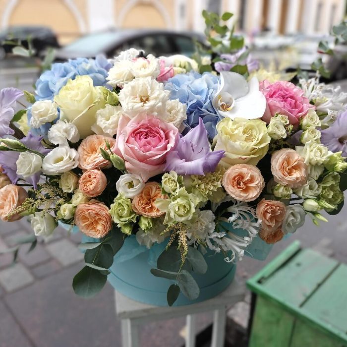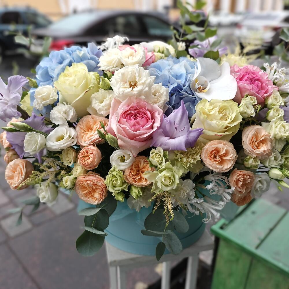 Коробка шляпная – 1 шт.Калька упаковка – 4 шт.оазис флористический кирпич – 2 шт.гортензии – 3 шт.Эвкалипт – 10 шт.Лизиантус – 5 шт.Астильба – 5 шт.Гладиолус – 3 шт.розы кустовые пионовидные – 7 шт.розы кустовые – 10 шт.Нерина – 5 шт.розы пионовидные – 7 шт.орхидея – 3 шт.Диантус кустовой – 7 шт.