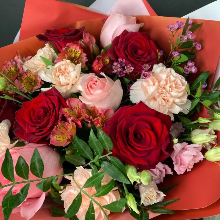Роза Эквадор – 7 шт.Диантус – 5 шт.Лизиантус – 1 шт.Альстромерия Микс Европа – 3 шт.Упаковка дизайнерская – 3 шт.Лента атласная – 1 шт.Ваксфлауэр – 1 шт.