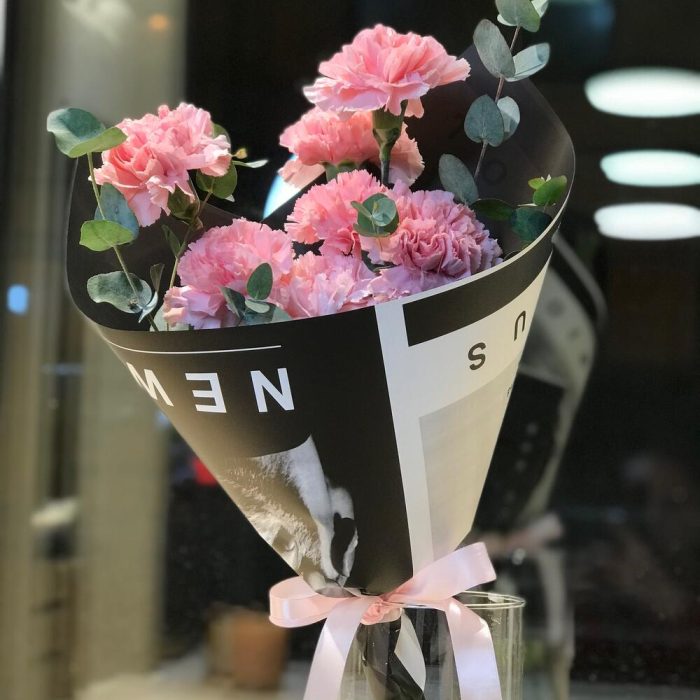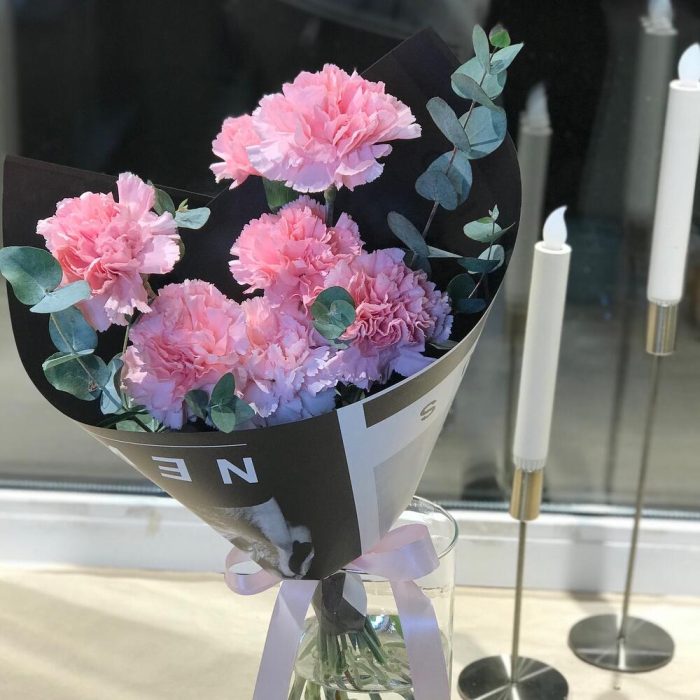 Диантус – 7 шт.Эвкалипт – 2 шт.Упаковка дизайнерская – 1 шт.Лента атласная – 1 шт.Средство для продления жизни цветов – 1 шт.