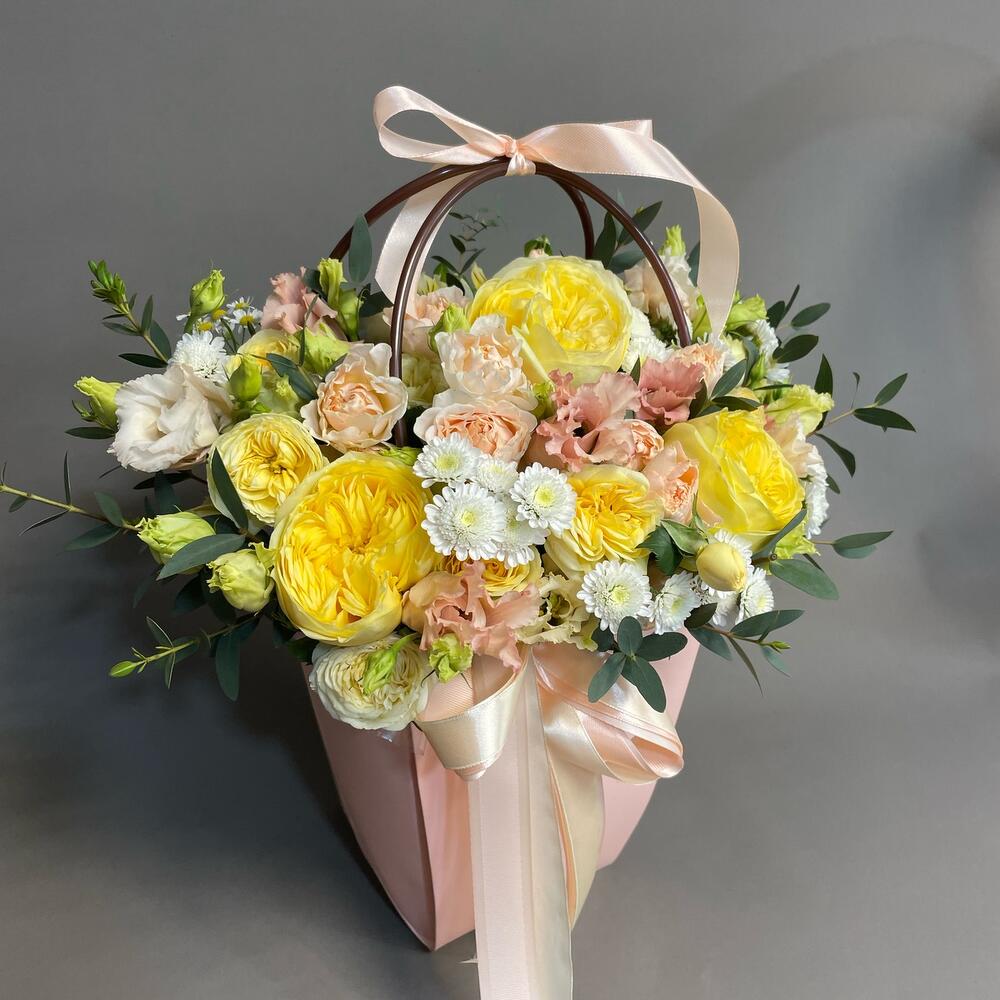пионовидная желтая роза – 3 шт.Кустовая роза – 5 шт.Диантус – 3 шт.Диантус кустовой – 3 шт.Эустома – 3 шт.Сантини – 3 шт.Эвкалипт – 2 шт.Альстромерия – 3 шт.Сумочка – 1 шт.Оазис флористический – 1 шт.ленты атласные – 3 шт.