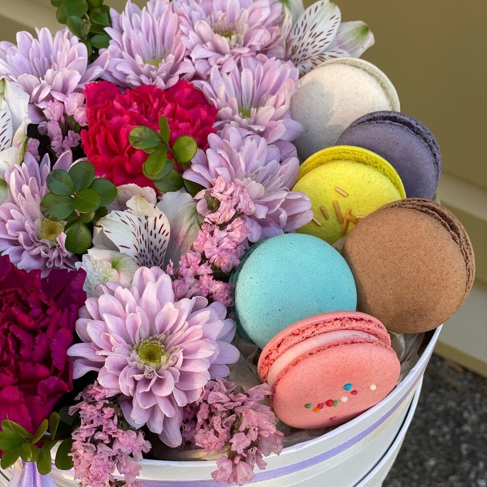 Альстромерия – 1 шт.Статица – 1 шт.Хризантема кустовая – 1 шт.Гвоздика – 2 шт.Тишью – 2 шт.Коробка шляпная – 1 шт.Самшит – 1 шт.Оазис флористический – 1 шт.макарон (пирожное) – 6 шт.