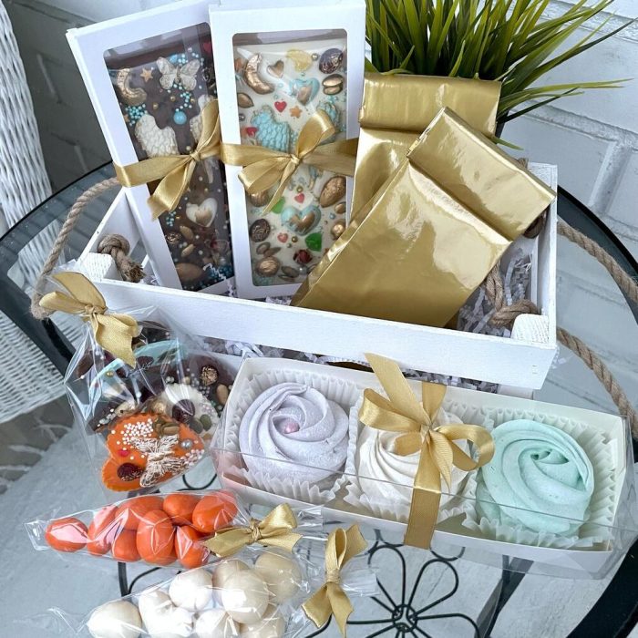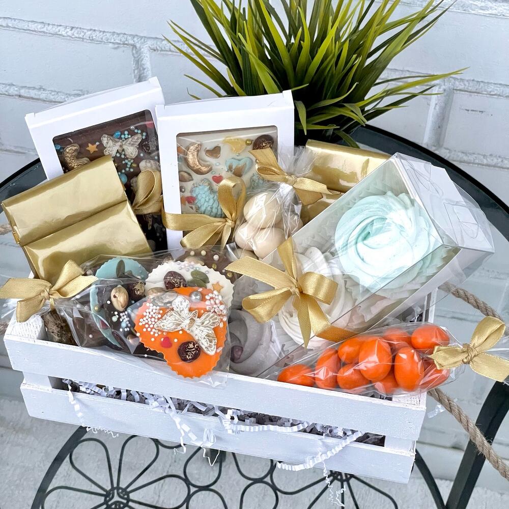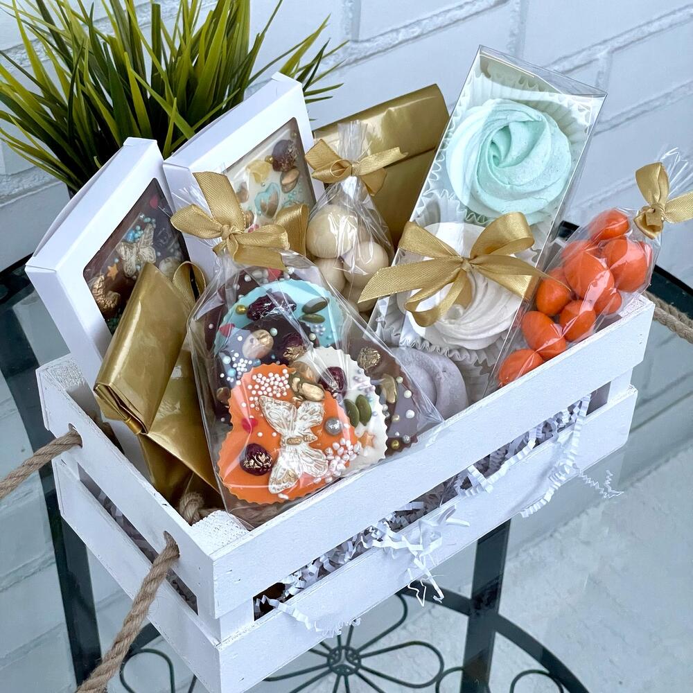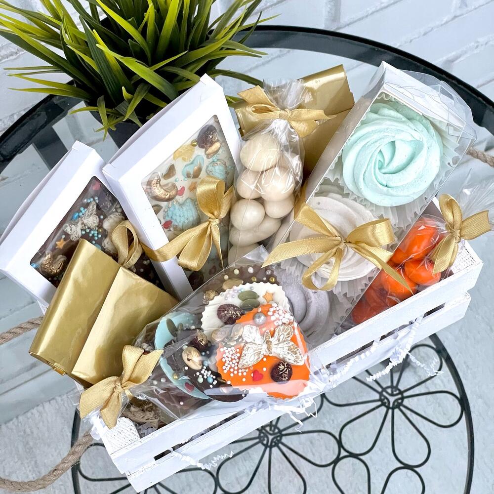 На День Рождения принято дарить что-то необычное и очень-очень вкусное!Корзинка с ароматным чаем, зефиром и шоколадом ручной работы – это то, что подарит эстетическое удовольствие и приведёт в восторг абсолютно любого, даже самого искушённого!В этот красивый набор мы положили: Две вкуснейшие бельгийские шоколадные плитки ручной работы. Из белого и молочного шоколада. С цельными орехами, сушёной клюквой, семечками и воздушным рисом, украшенные золотым пищевым кандурином. Нежнейший зефир ручной работы 3-х разных вкусов. Лавандовый, мятный и лимонный с ноткой ванили. Медианты ручной работы из белого, молочного, тёмного и апельсинового Бельгийского шоколада, также украшенные орешками, клюквой, семечками, воздушным рисом и золотым кандурином. Орешки- кешью в белом шоколаде и миндаль в глазури со вкусом манго. И конечно же ароматный черный и зелёный чай с фруктовыми добавками. Состав чёрного чая: Черный чай, плоды шиповника, сушёной яблоко, лемонграсс, лепестки василька, лепестки незабудки, ананас, цукаты. Состав зелёного чая: Чай зелёный байховый, плоды шиповника, лемонграсс, цедра цитрусовых, лепестки календулы, мята. Открытка авторская с Вашими пожеланиями. И частичка тепла в каждом наборе. Мы делали с любовью ❤️Подарите вкусные яркие эмоции себе и Вашим Любимым.