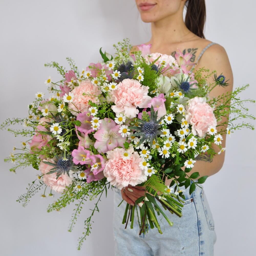 Ароматный букет с ромашками, колокольчиками и гвоздиками.Прелестные стойкие цветы слились в великолепном вальсе с голубыми колючками эрингиума, создавая непередаваемую атмосферу свободы, расслабления и счастья!Букет в европейском стиле, собран для вручения без упаковки!Будет красиво смотреться в вазе – круглый и нарядный со всех сторон!Истинная красота цветов для вашей ненаглядной.Доставим на воде и коробке, бережно и с заботой)