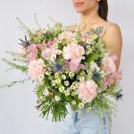 Альстромерия – 6 шт.Кампанула – 10 шт.Тласпи – 1 шт.Эрингиум – 4 шт.Гвоздика розовая – 9 шт.Ромашка кустовая – 15 шт.Фисташка – 8 шт.амбрелла – 3 шт.