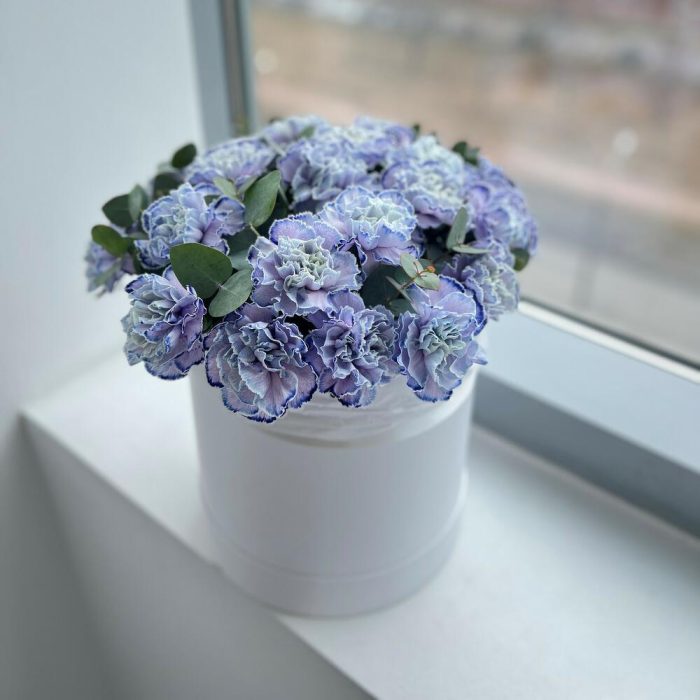 Шляпная коробка с лавандовой гвоздикой и эвкалиптом, 25 см в диаметре и 35 см высотой