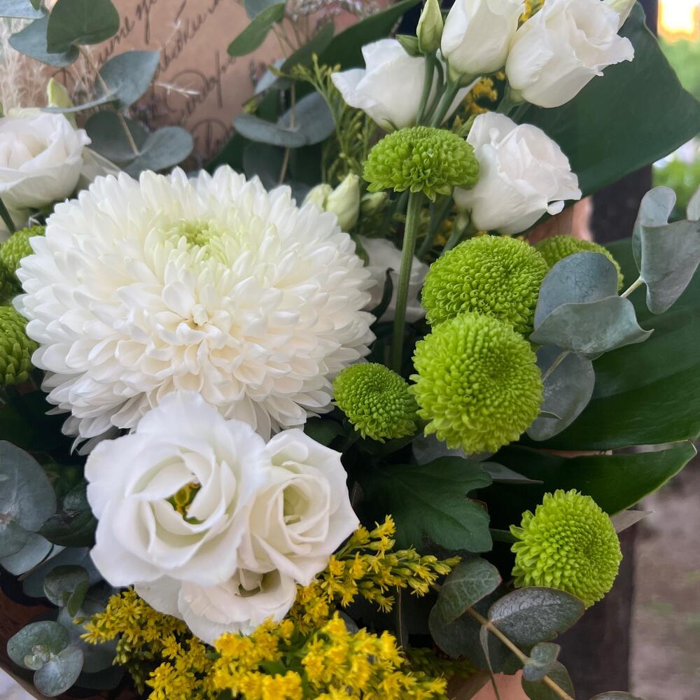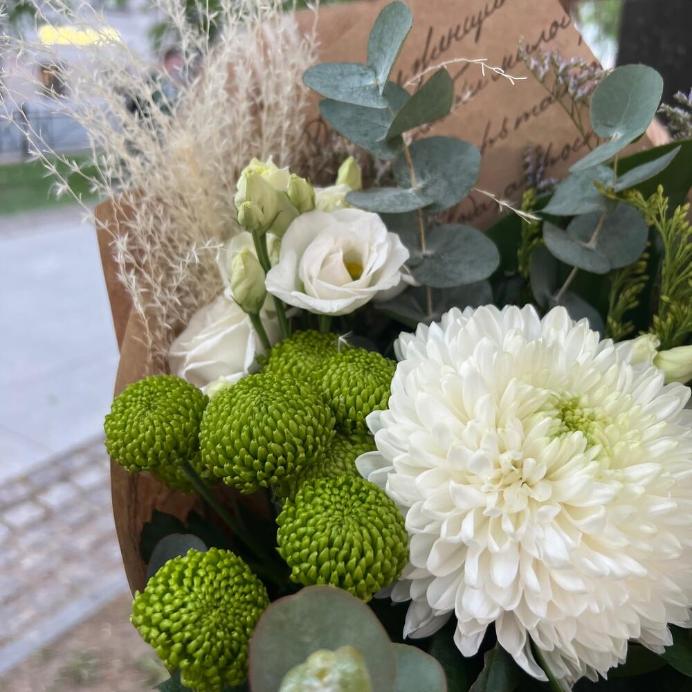 Хризантема – 1 шт.Хризантема кустовая – 2 шт.Солидаго – 2 шт.Лизиантус – 2 шт.Эвкалипт – 1 шт.Зелень – 1 шт.Лимониум – 1 шт.Сухоцвет – 1 шт.Упаковка дизайнерская – 1 шт.
