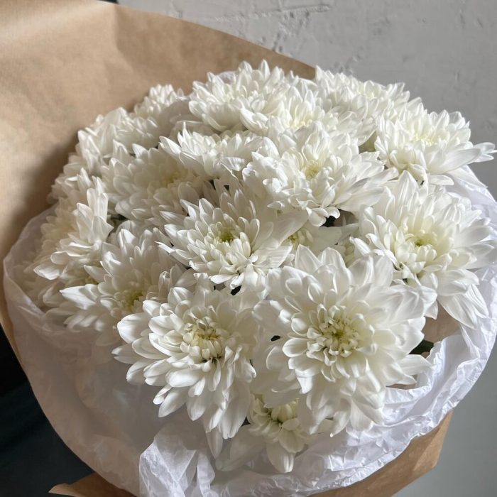 Хризантема кустовая – 5 шт.Лента атласная – 2 шт.Упаковка дизайнерская – 2 шт.
