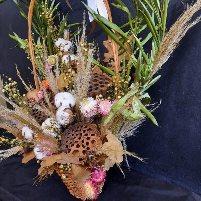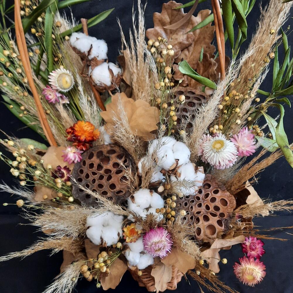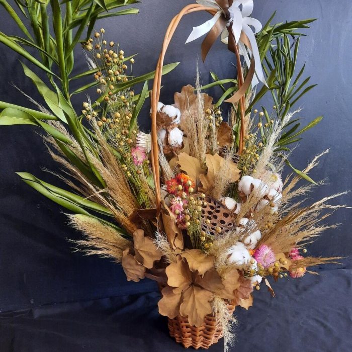 Лотос – 3 шт.Лента атласная – 3 шт.Корзина плетеная – 1 шт.Оазис флористический – 1 шт.Гелихризум – 18 шт.Дуб – 3 шт.Хлопок ветка – 1 шт.кортадерия – 6 шт.олеандр – 1 шт.лен пучок – 1 шт.