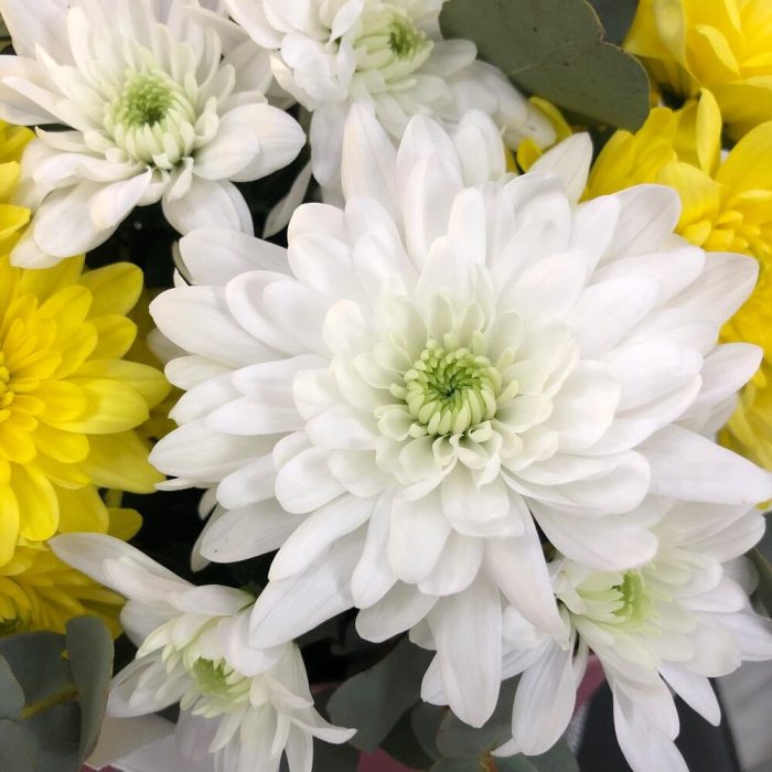 Хризантема кустовая – 7 шт.Эвкалипт Микс – 1 шт.Оазис флористический – 1 шт.Сумочка – 1 шт.