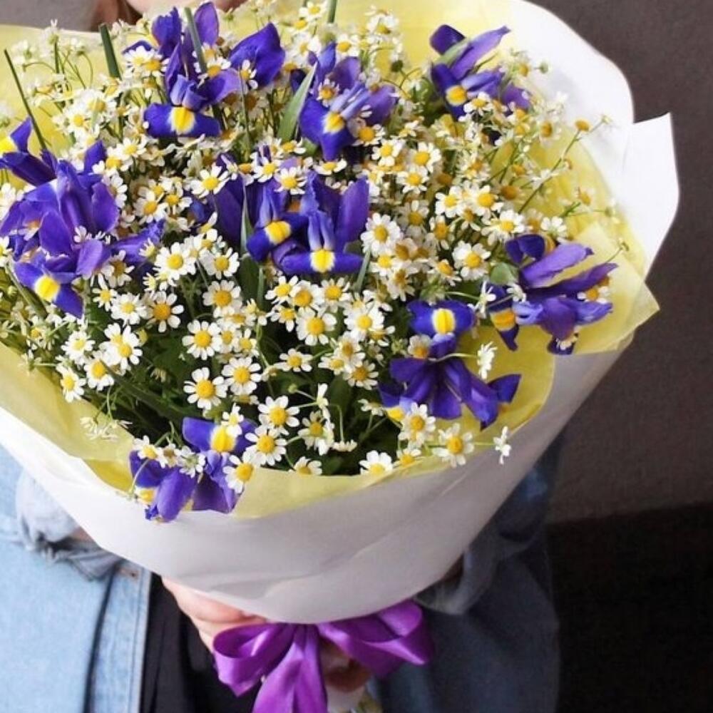 Ирис – 11 шт.Лента атласная – 2 шт.Матрикария – 10 шт.Упаковка дизайнерская – 3 шт.