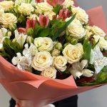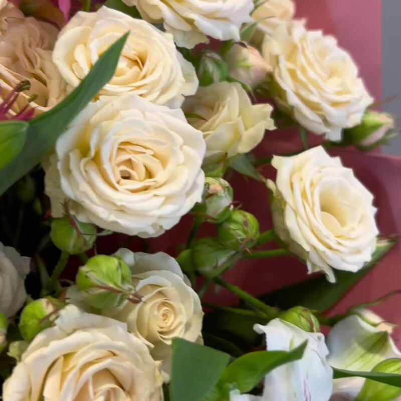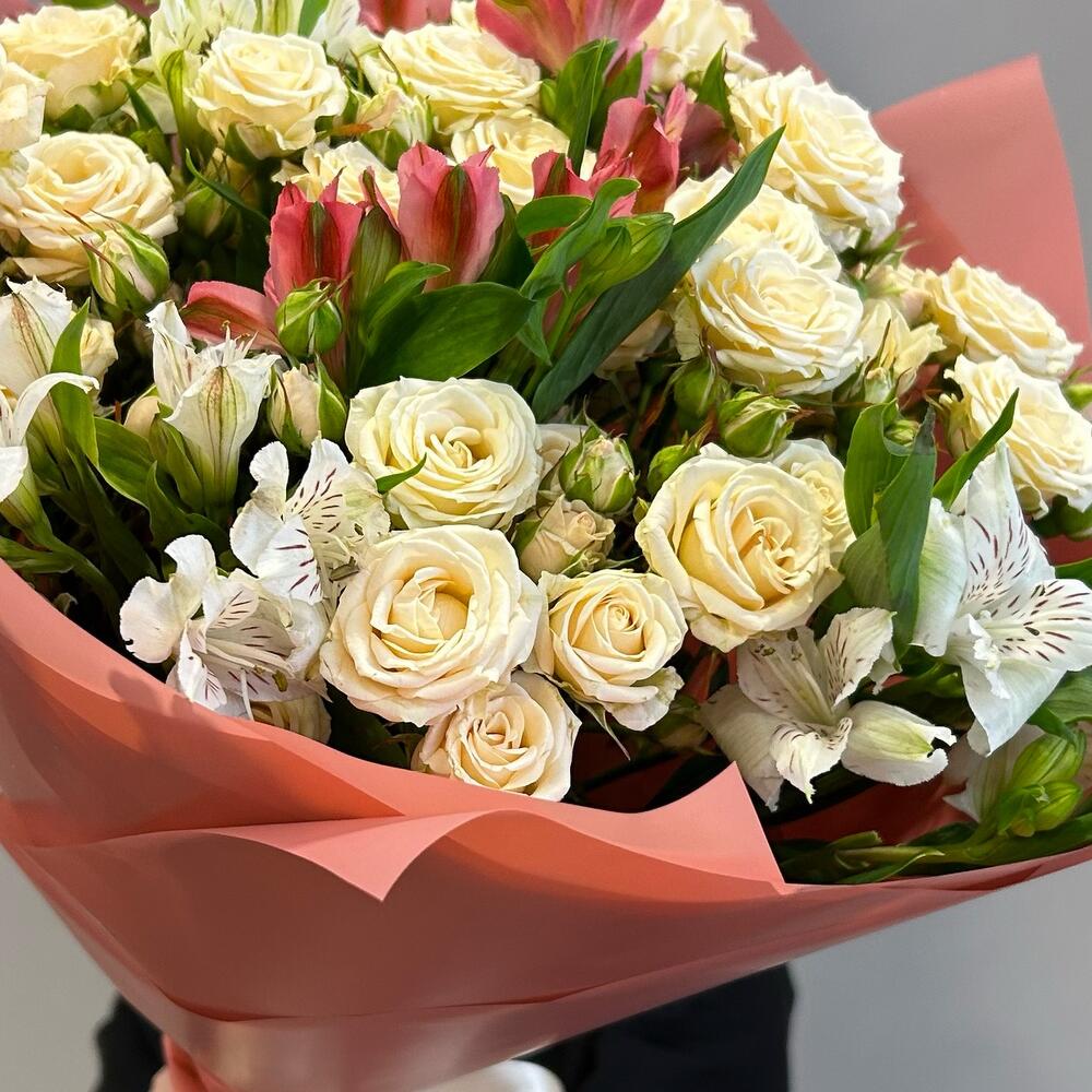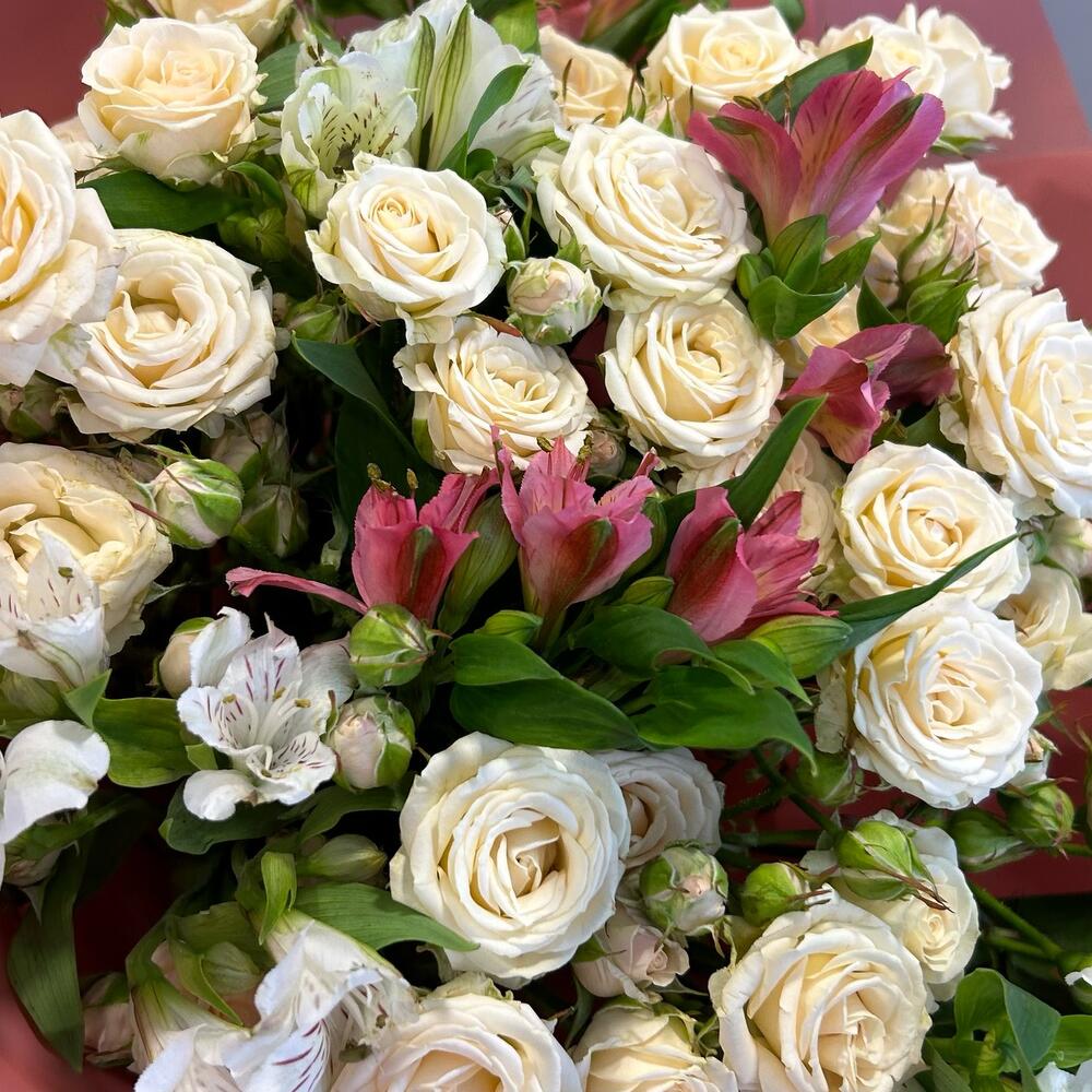 Альстромерия – 6 шт.Роза кустовая – 5 шт.Зелень – 3 шт.Лента атласная – 2 шт.Упаковка дизайнерская – 3 шт.