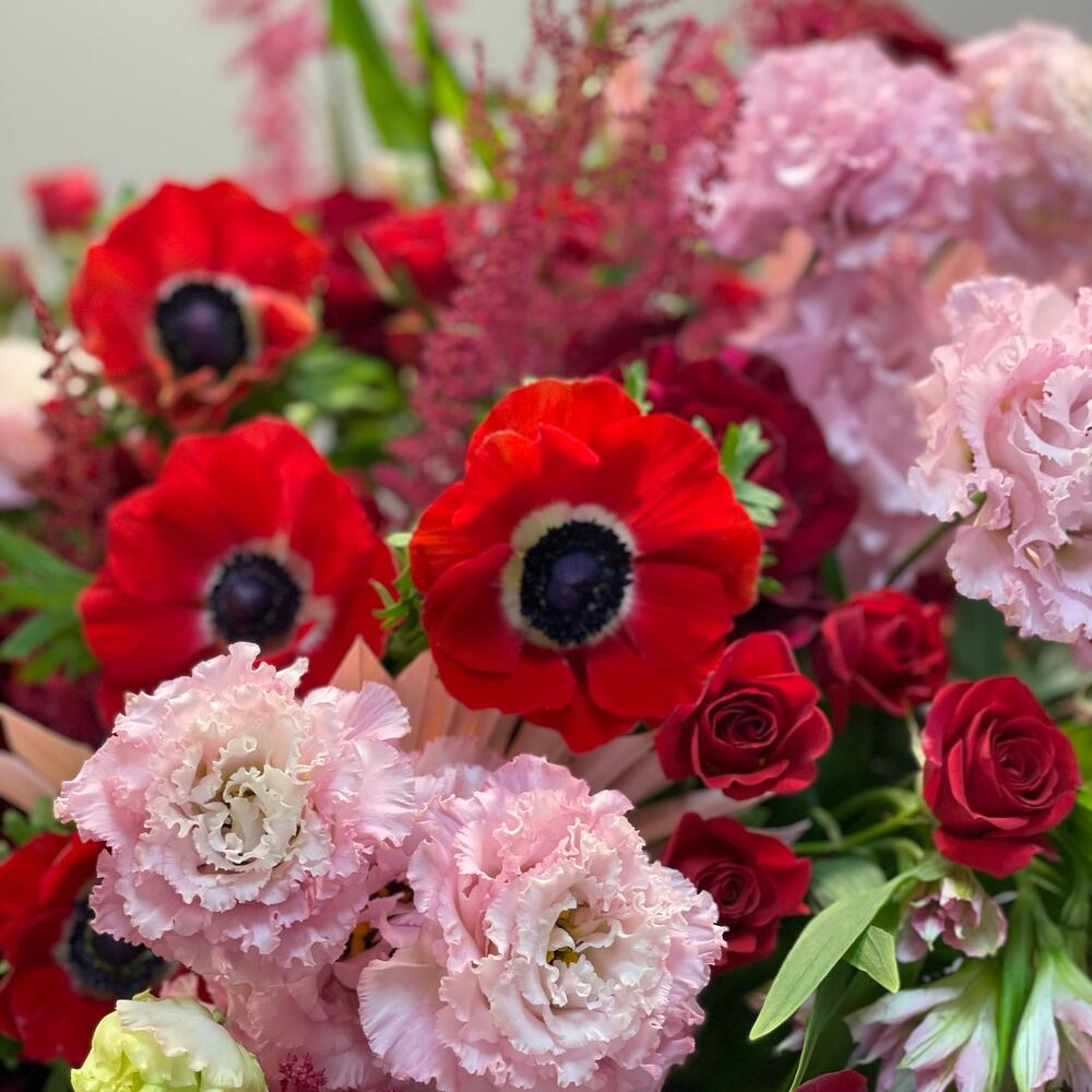 Альстромерия – 10 шт.Анемон – 9 шт.Астильба – 5 шт.Папоротник – 3 шт.Роза кустовая – 9 шт.Зелень – 5 шт.Пальма – 2 шт.Сухоцветы – 5 шт.Шляпная коробка – 1 шт.Лизиантус розовый – 19 шт.Оазис флористический – 5 шт.Роза Эквадор Премиум – 25 шт.