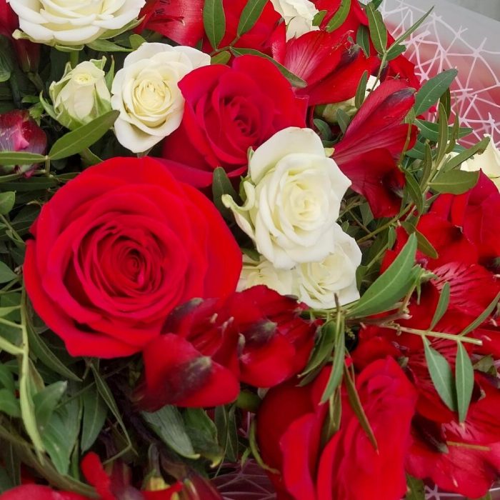 Роза Эксплорер – 11 шт.Роза кустовая белая – 7 шт.Альстромерия красная – 7 шт.фисташка зелень – 15 шт.Упаковка дизайнерская – 3 шт.