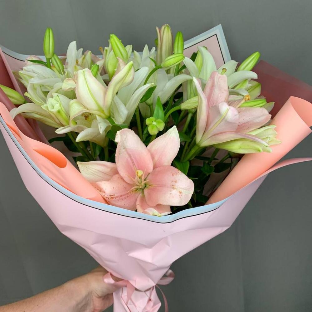 лилия ориентальная розовая – 7 шт.лилия ориентальная белая – 8 шт.Упаковка дизайнерская – 2 шт.Атласная лента – 1 шт.