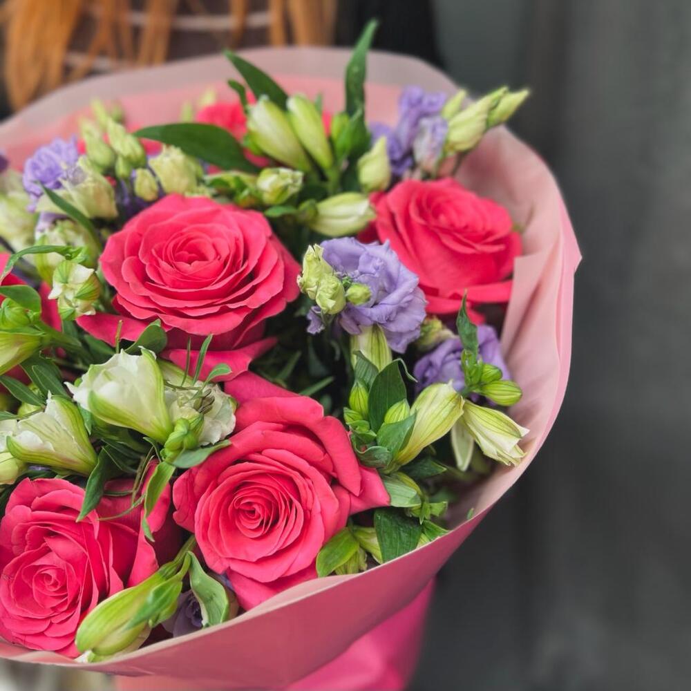 Роза – 7 шт.Альстромерия – 5 шт.Лизиантус – 6 шт.Упаковка дизайнерская – 1 шт.зелень декоративная – 535 шт.