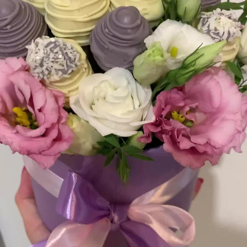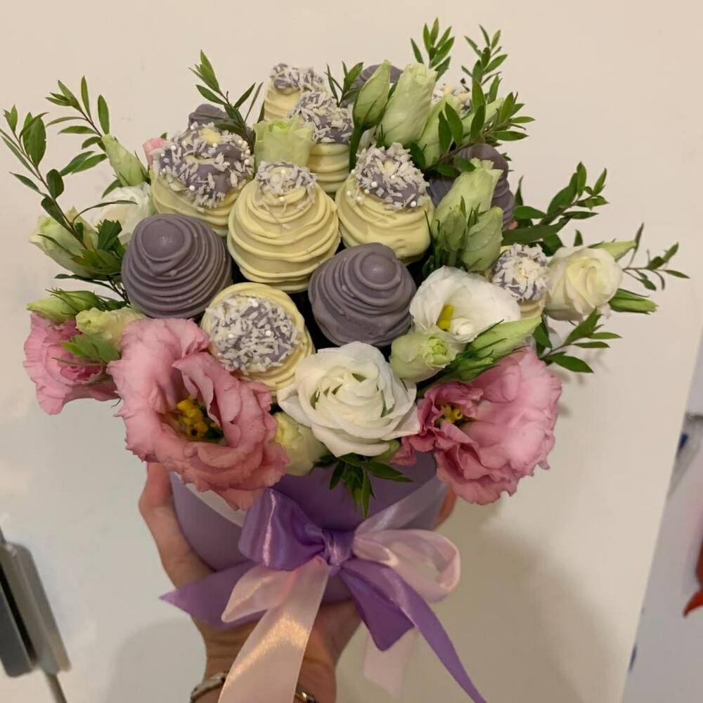 Лизиантус – 3 шт.Коробка шляпная – 1 шт.Клубника в шоколаде callebaut (бельгия) – 8 шт.Губка флористическая – 4 шт.зелень декоративная – 2 шт.ленты атласные – 1 шт.упаковка транспортировочная – 1 шт.