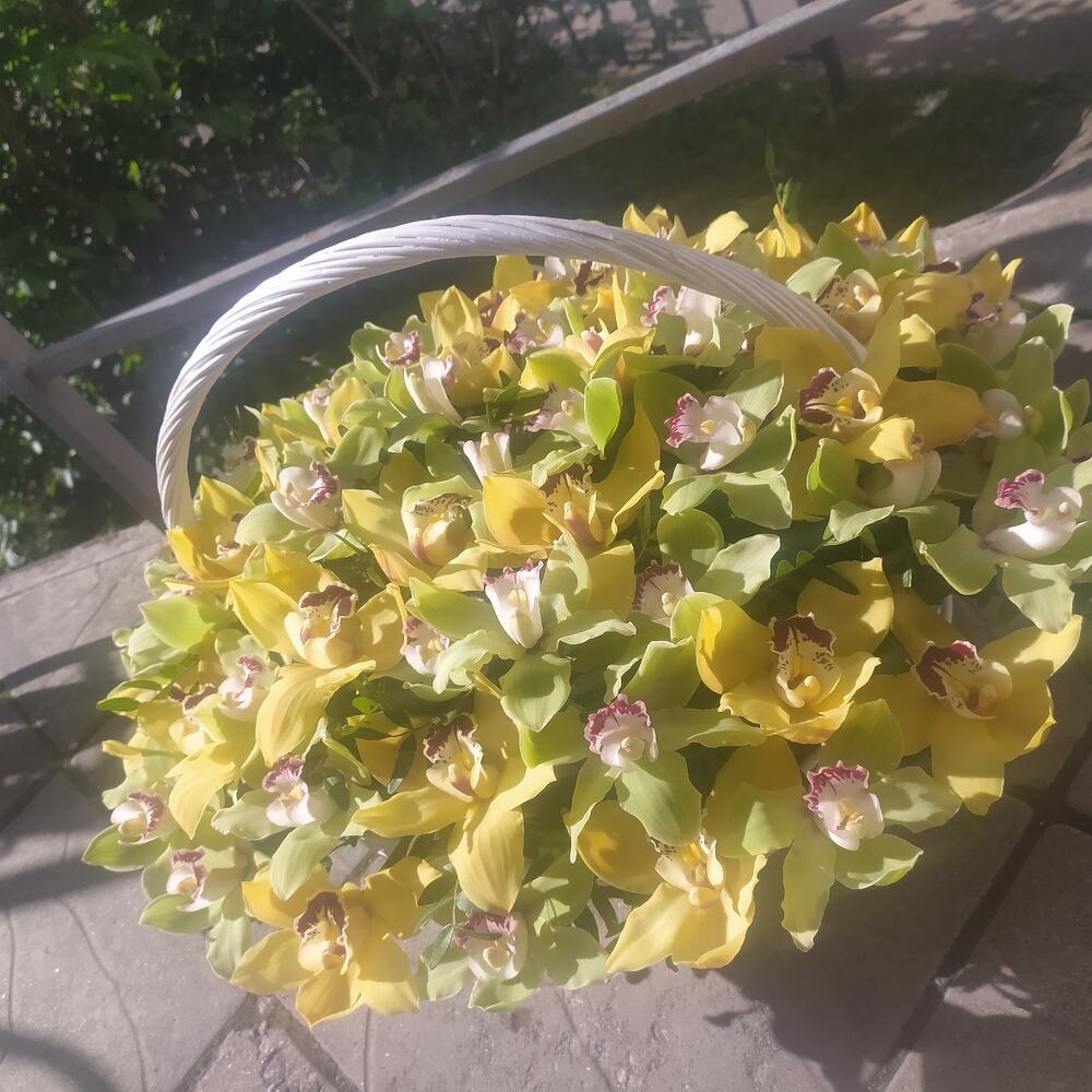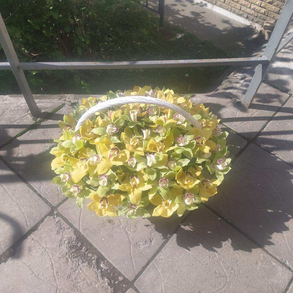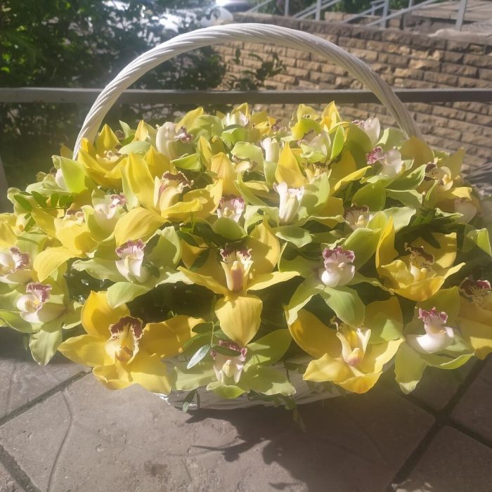 Орхидея Цимбидиум – 4 шт.Корзина плетеная – 1 шт.Оазис флористический – 3 шт.зелень декоративная – 20 шт.