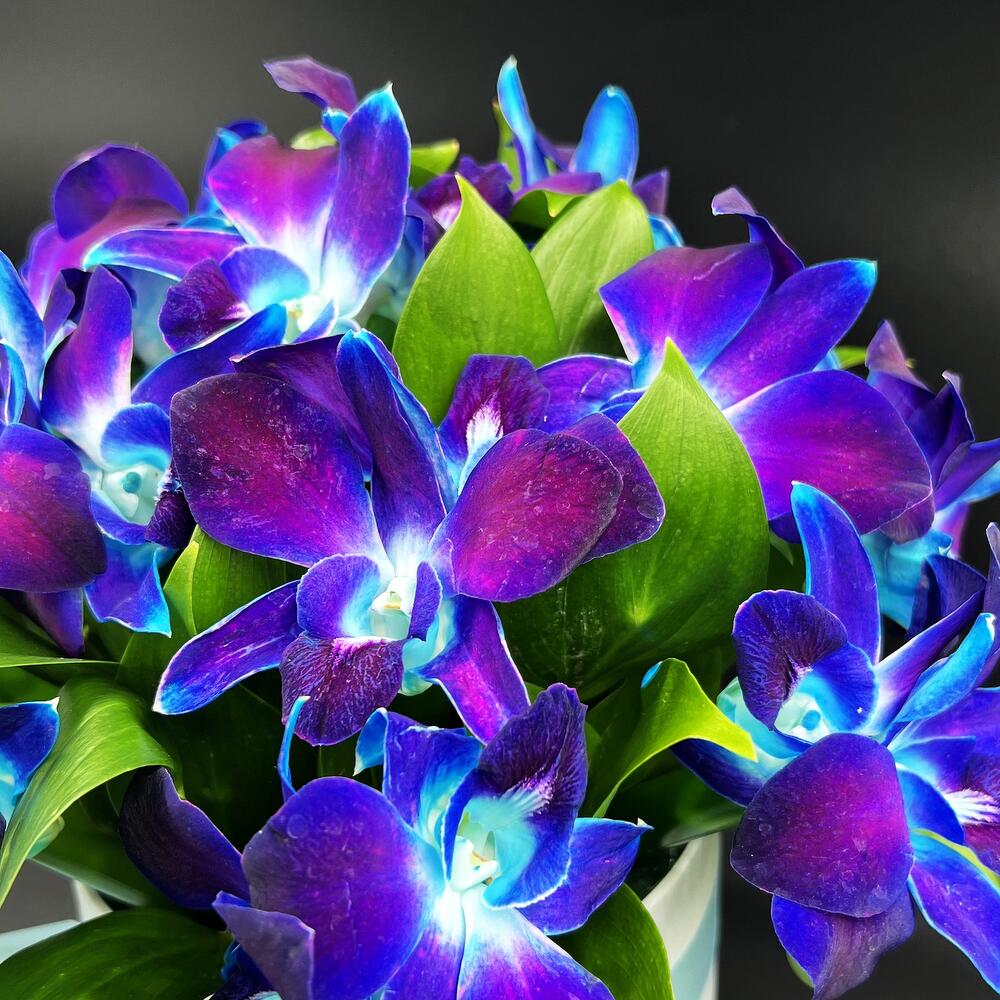 орхидея дендробиум синяя бутоны – 29 шт.удлинитель для орхидеи – 15 шт.Рускус – 10 шт.любовь флориста (бесплатно) – 1 шт.Шляпная коробка – 1 шт.Лента атласная – 1 шт.инструкция по уходу за цветами – 1 шт.Средство для продления жизни цветов – 1 шт.