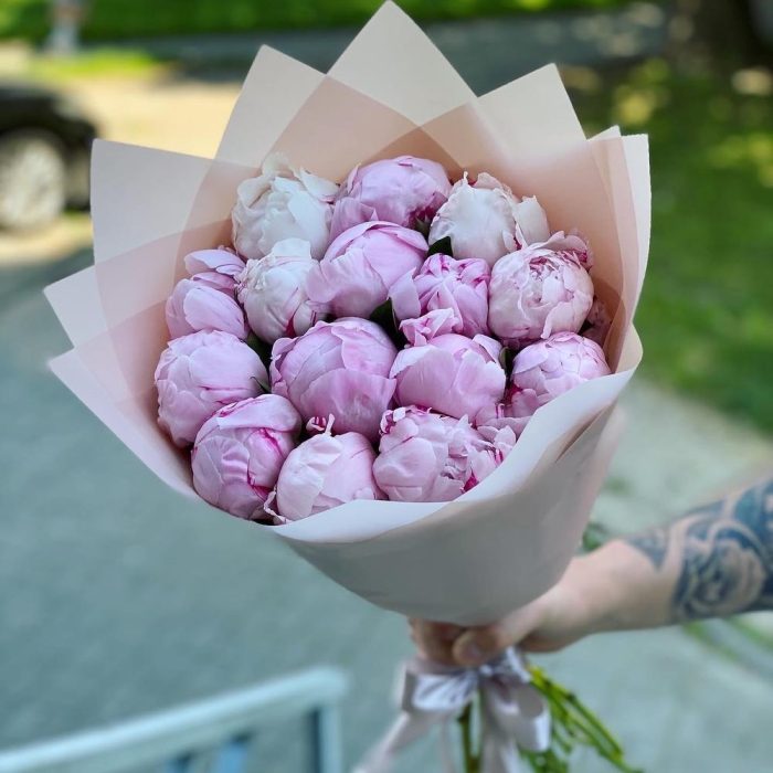 Лента – 1 шт.Пион Сара Бернар – 15 шт.Упаковка дизайнерская – 4 шт.
