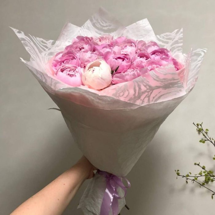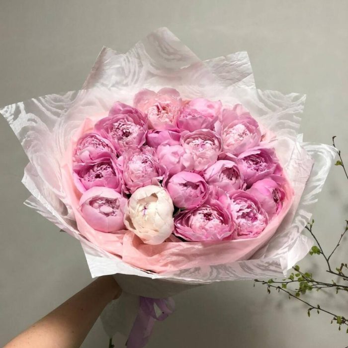 Лента атласная – 1 шт.Пион Сара Бернар – 19 шт.Упаковка дизайнерская – 2 шт.