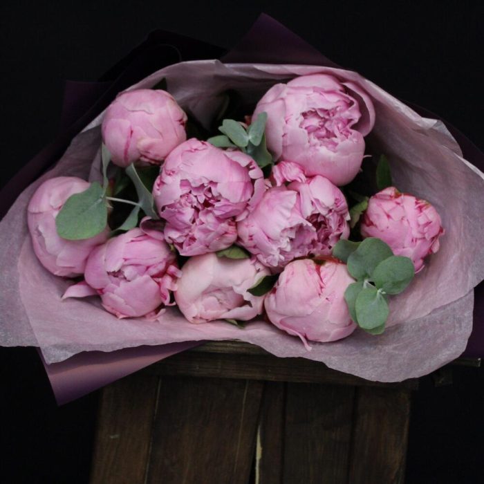 Эвкалипт – 2 шт.Лента атласная – 1 шт.Тишью – 2 шт.Пион Сара Бернар – 9 шт.Пленка матовая – 2 шт.