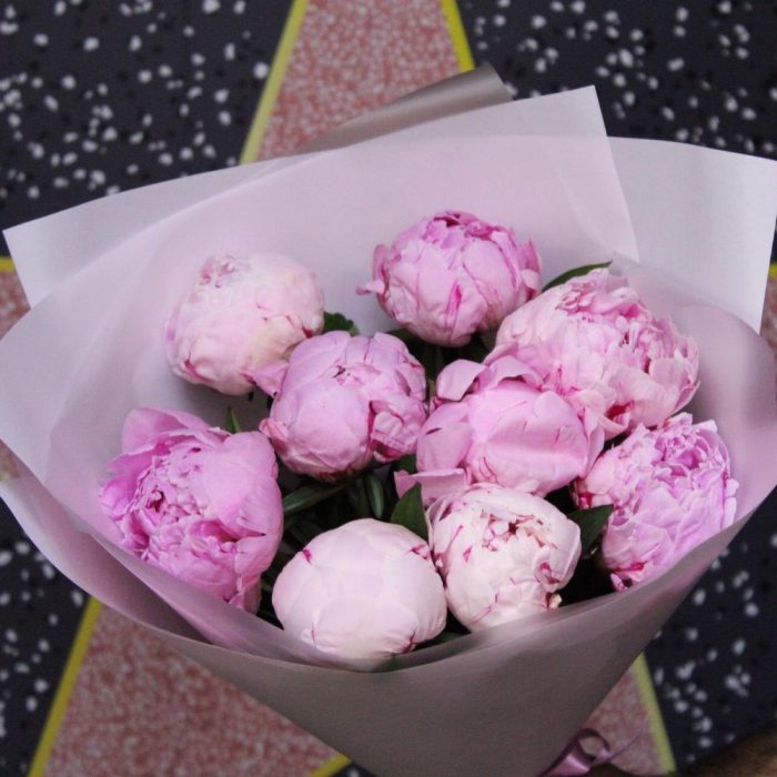 Лента атласная – 1 шт.Пион Сара Бернар – 9 шт.Пленка дизайнерская – 3 шт.