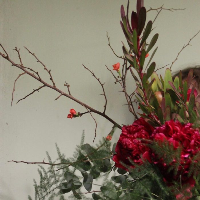 Лента – 1 шт.Пион – 9 шт.Эвкалипт – 7 шт.Орнитогалум – 2 шт.ирландский колокольчик – 2 шт.ветки аспарагуса – 3 шт.левкакендрон – 3 шт.