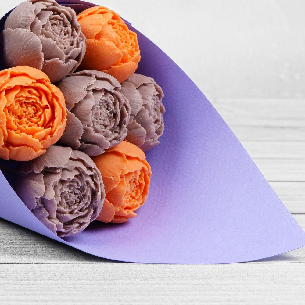 Букет из 7 шоколадных пионов оранжево-сиреневых в дизайнерском картоне