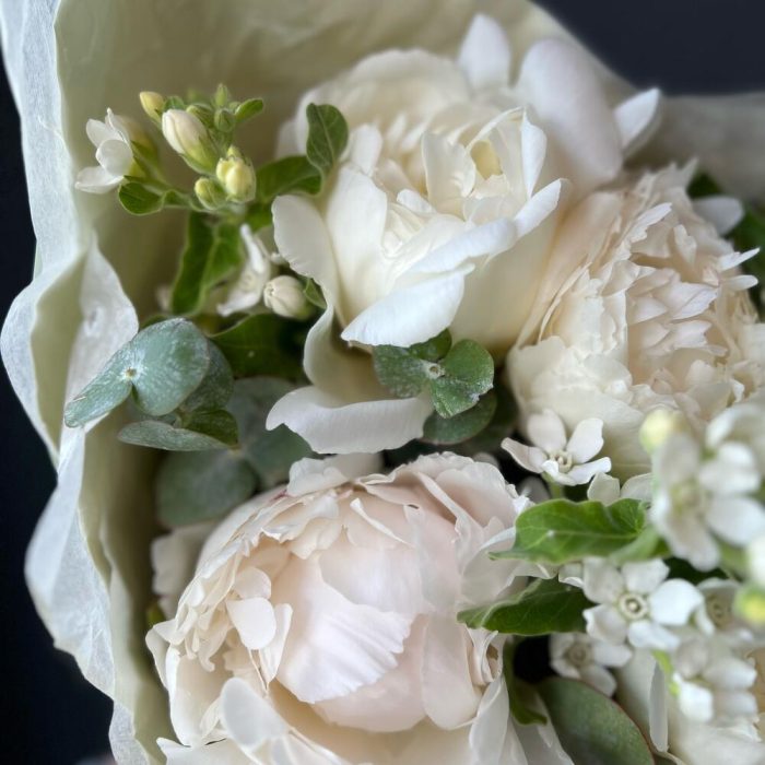 Пион – 5 шт.Оксипеталум – 3 шт.Эвкалипт – 3 шт.декоративная упаковка – 1 шт.Атласная лента – 1 шт.