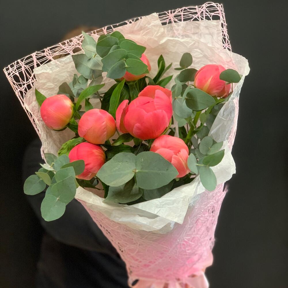 Тишью – 3 шт.Атласная лента – 1 шт.Дизайнерская упаковка – 1 шт.пионы – 7 шт.Эвкалипт – 1 шт.