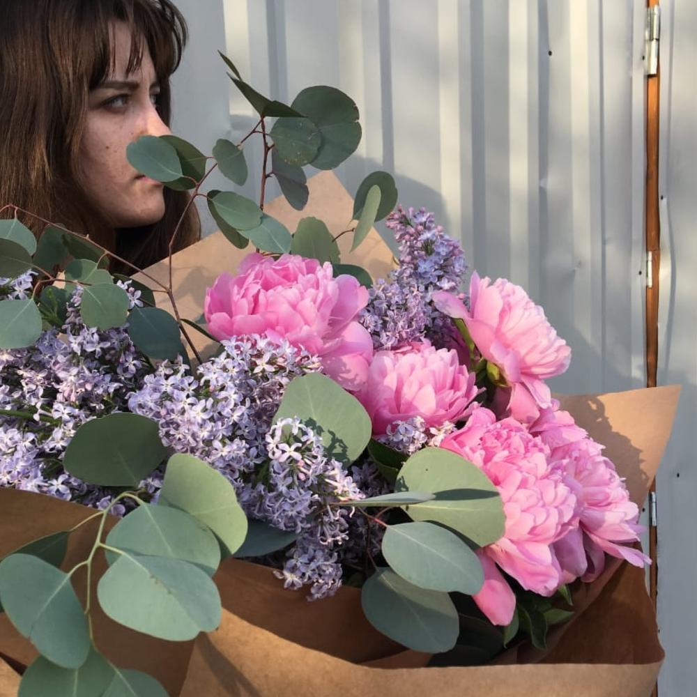 Лента – 2 шт.Пион – 5 шт.Сирень – 9 шт.Эвкалипт – 3 шт.Упаковка крафт – 2 шт.