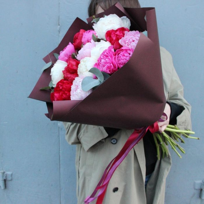 Букет из 21 кораллового пиона в дизайнерской упаковке "Коралл Саншайн"