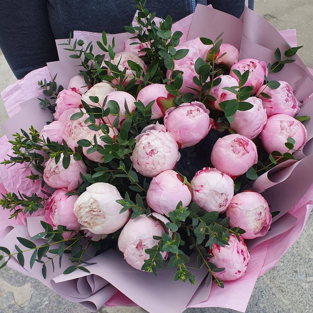 Пион Сара Бернар – 31 шт.Эвкалипт – 5 шт.Упаковка дизайнерская – 3 шт.